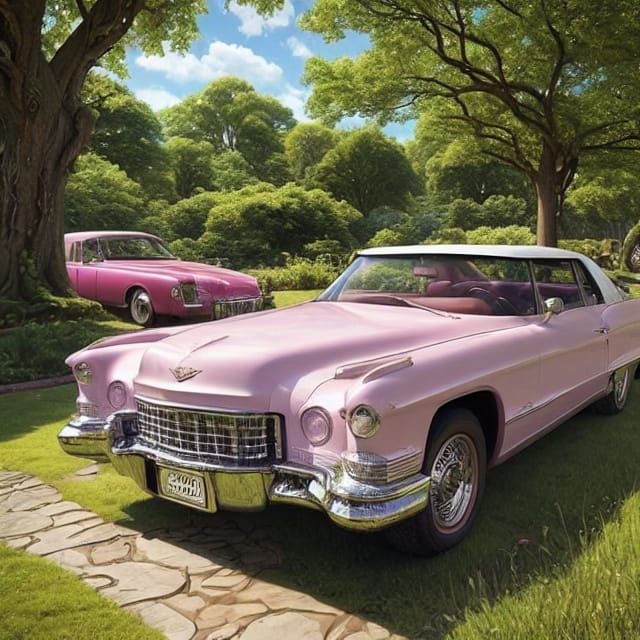 A hyper-realistic digital artwork featuring a pink Cadillac parked at Graceland. The image showcases vibrant colors, glossy reflections, and golden hour lighting in a lush, sunny setting.