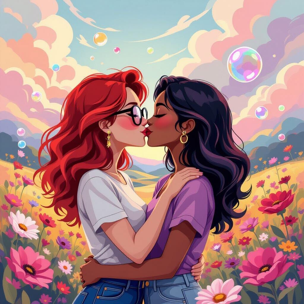 This image shows a stylized humanoid couple sharing a tender moment amidst swirling flowers and bubbles. The scene is set in an abstract landscape with vibrant colors and expressive brushstrokes, as 2D digital art.