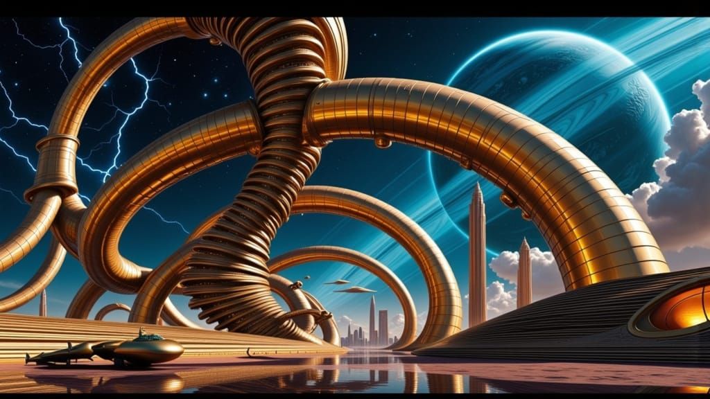 A striking picture of a cosmicpunk cityscape featuring impossible staircases and spiraling pipes. The image has a dark, futuristic aesthetic with warm, mysterious lighting.