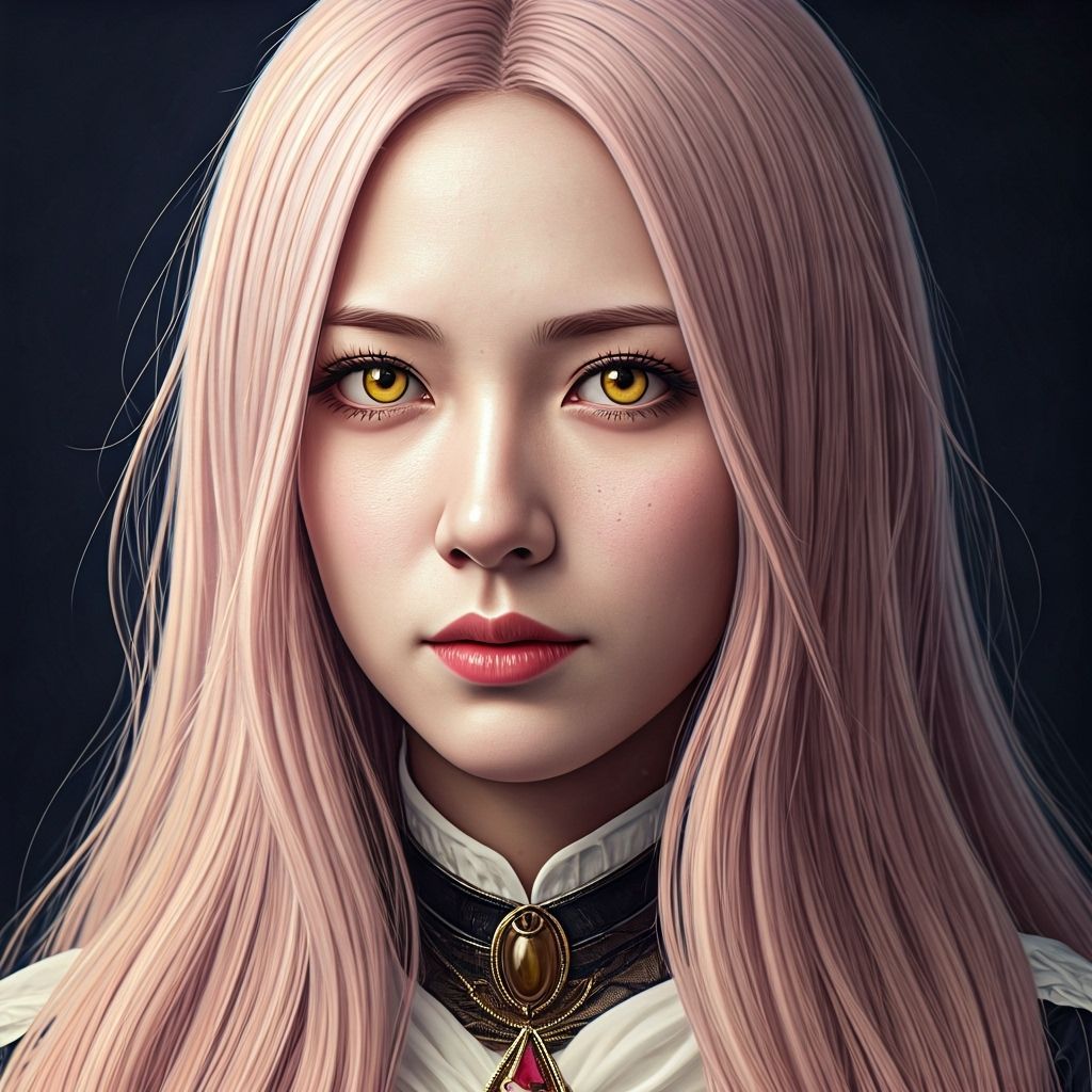 This image shows a beautiful woman with pale pink hair and striking yellow eyes, in vintage photograph style. The elegant attire and realistic face are reminiscent of 1900s portraiture.