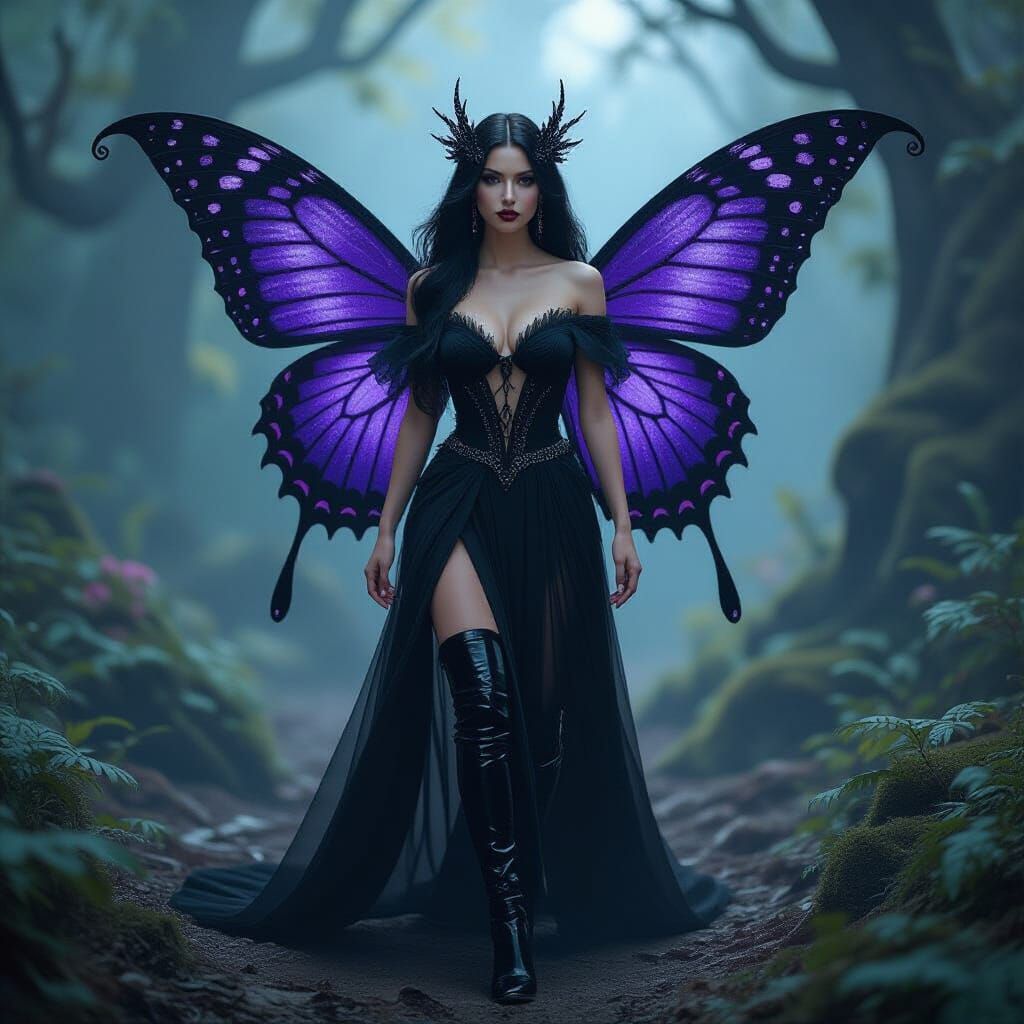 This image shows a fairy goddess in a mystical realm. She has long black hair and butterfly wings, wearing a diaphanous dress and thigh-high boots. The artwork features cinematic lighting and film grain.