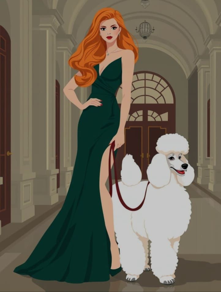 This image shows a stylish Art Deco woman with strawberry blonde hair in a long green dress, posing with a white poodle in a geometric hall. The scene evokes 1920s posters with a modern vectorized style.