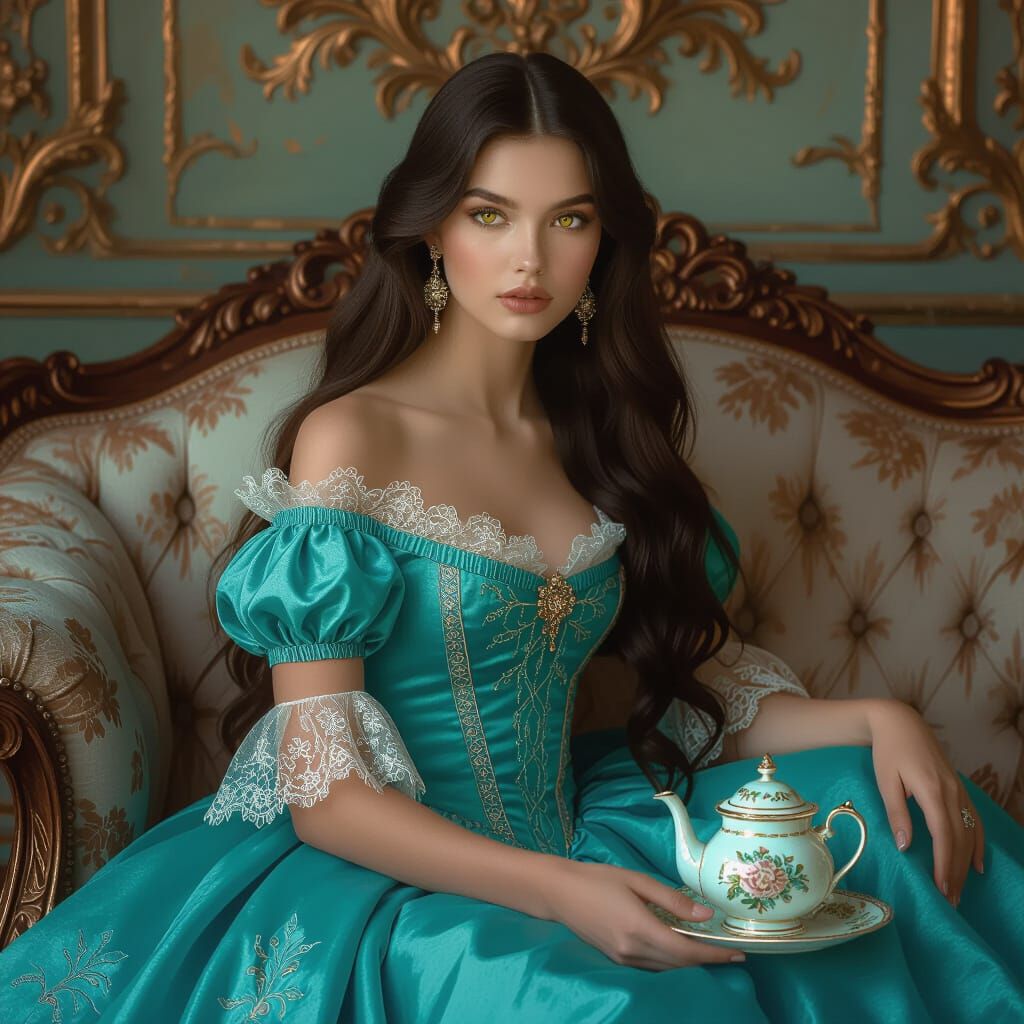 A striking picture of a woman with flowing blue hair and yellow eyes seated on a rococo sofa. She wears a turquoise gown with lace details, depicted with volumetric lighting in a classical painting style.