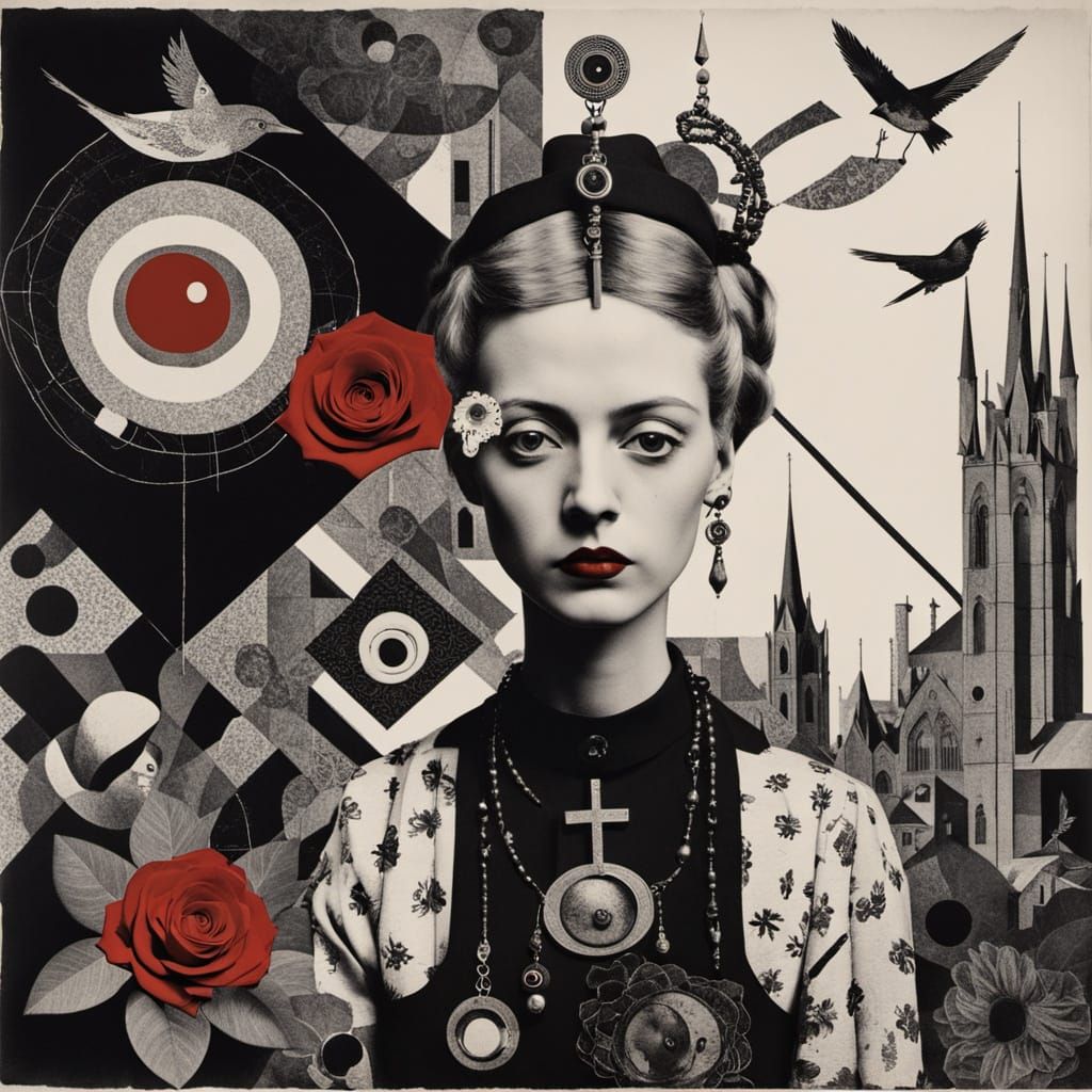 A surreal portrait of a punk icon with goth attire and a flaming heart, featuring fragmented wings and a black bird. Rendered in high-contrast black and white with geometric shapes, inspired by Dada art.