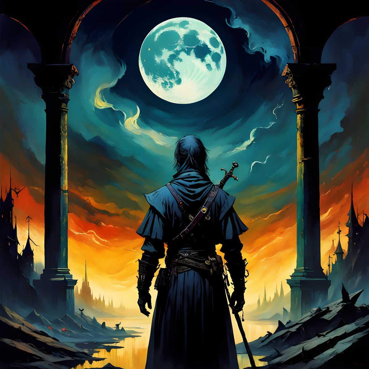 This image shows a twilight moonscape blending gothic, folk, and occult elements. The artwork features a complex, ominous, and dystopian scene reminiscent of a post-apocalyptic world, in an academic art style.