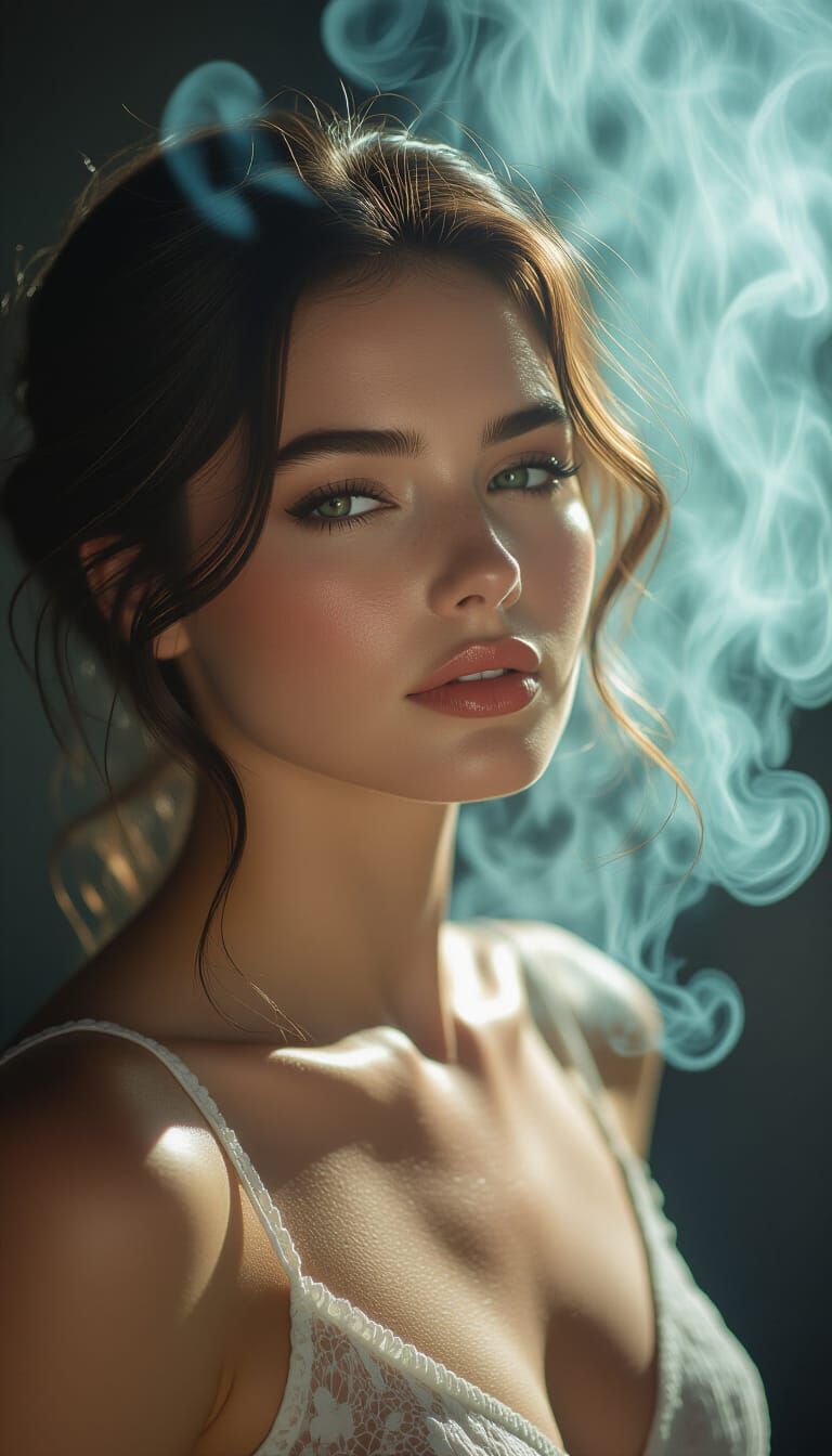 This image shows a woman posing in smoke for a striking portrait. The image features cinematic lighting and film grain, with post-processing inspired by dramatic, photorealistic styles.