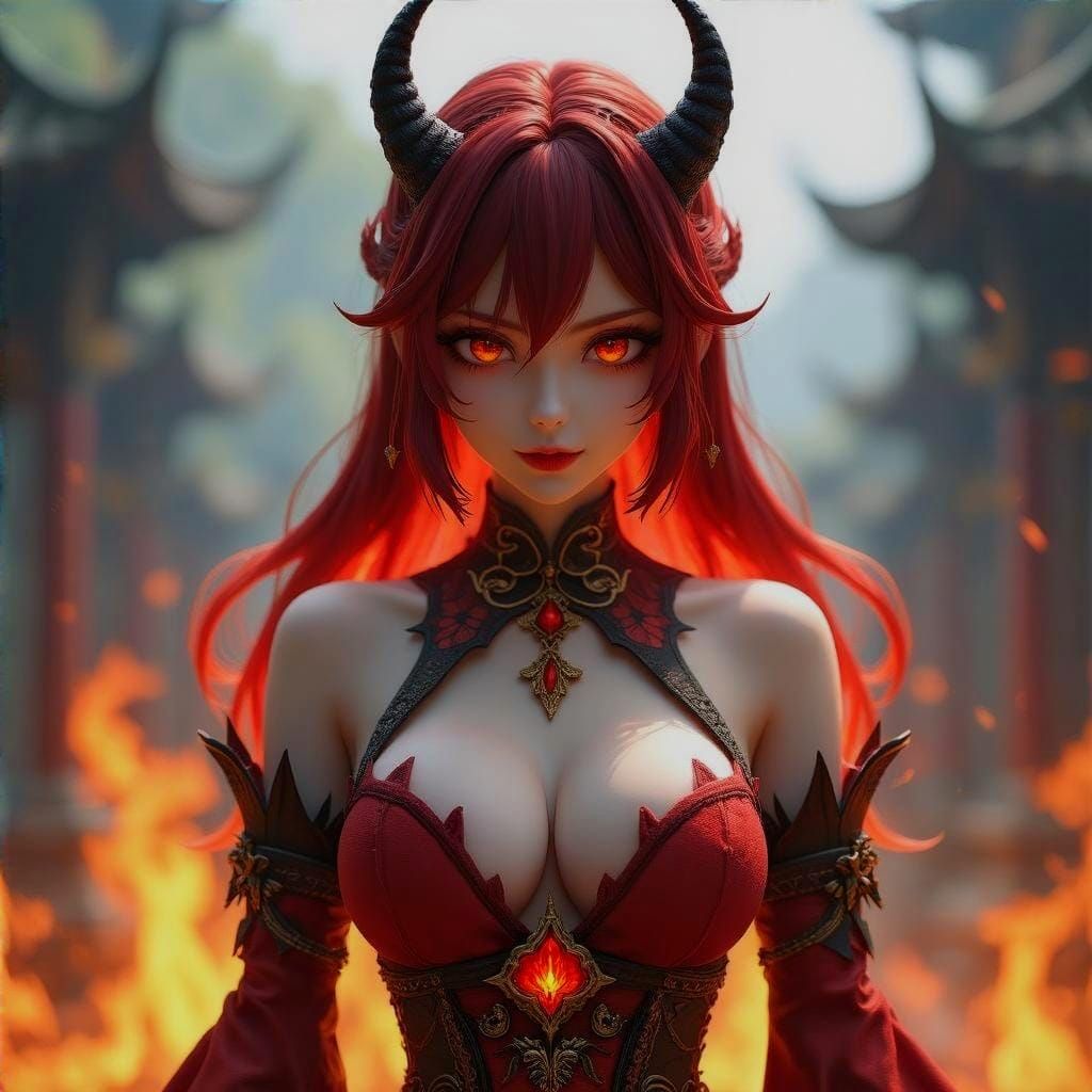 This image shows a striking devil woman engulfed in flames. The 3D anime art features extreme detail and aesthetic elements reminiscent of concept art, rendered in breathtaking 8k resolution.