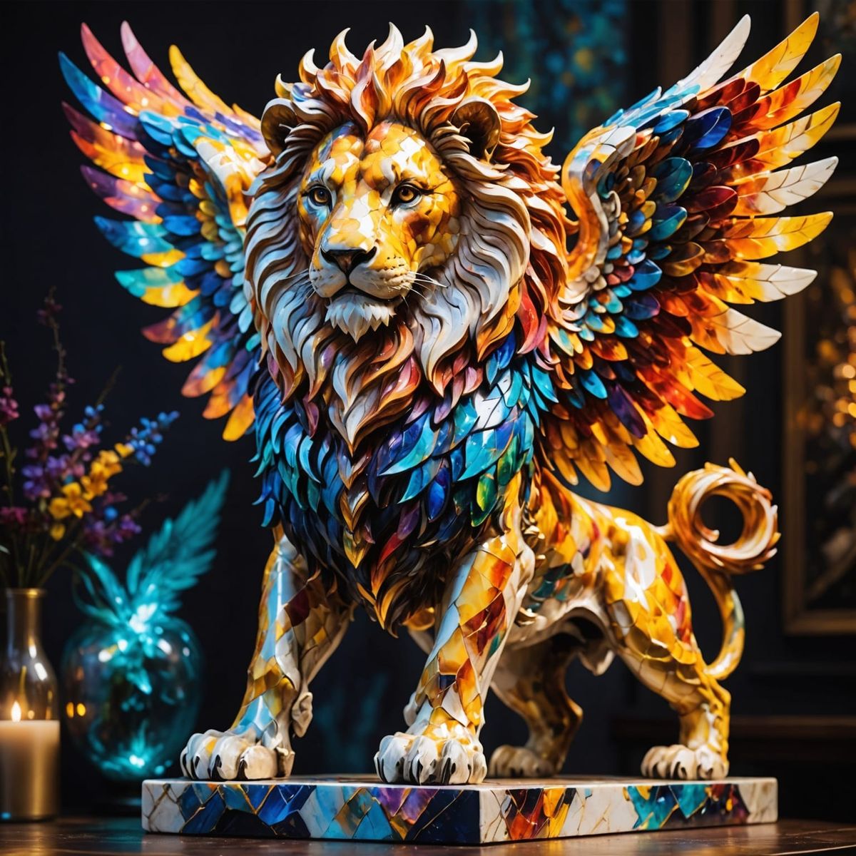 This image showcases a detailed marble statue of a winged lion, brought to life with glowing accents and a vibrant, artistic color palette.
