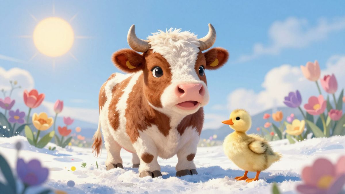 This image shows a very cute, smiling cow with a duckling in a snowy winter scene, surrounded by multicolored fantasy flowers. Rendered in watercolor with cinematic lighting and imperial colors.