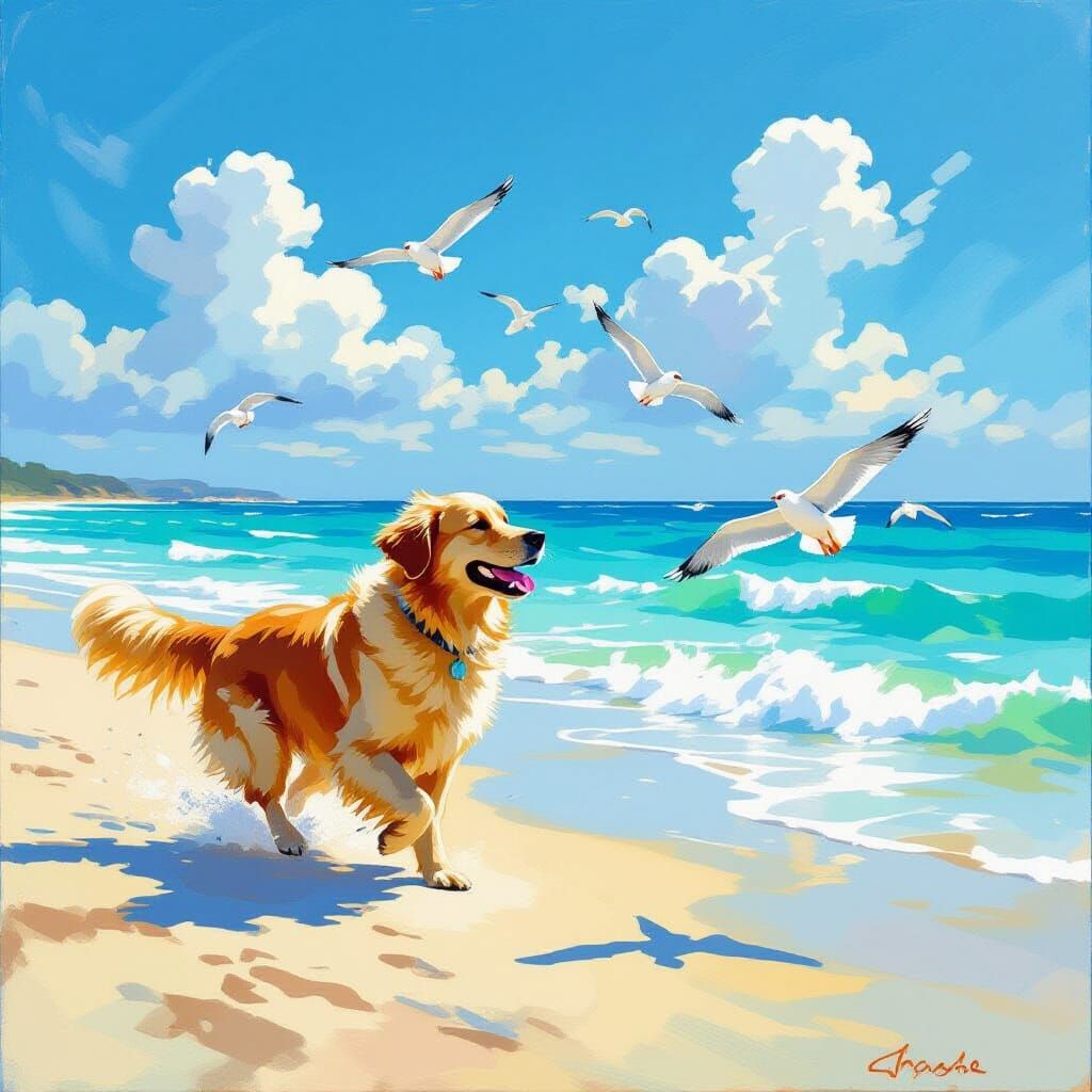 This impressionistic oil painting captures a golden retriever joyfully chasing seagulls on a bright, sunlit beach. The vibrant turquoise ocean and vivid blue sky emphasize light and energetic movement.