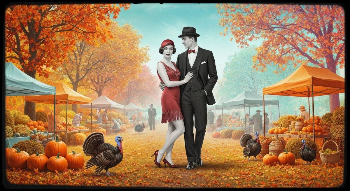 This image shows a 1920s couple in flapper attire amidst a lively harvest festival. The scene is rendered with a stroboscopic effect and fluorescent tints in a surreal vintage style.