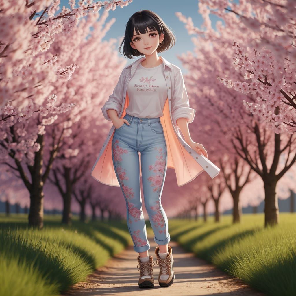 This anime-style digital art shows a young woman with black hair and brown eyes, wearing a white shirt and blue jeans with floral prints. She stands in a sunlit cherry orchard.
