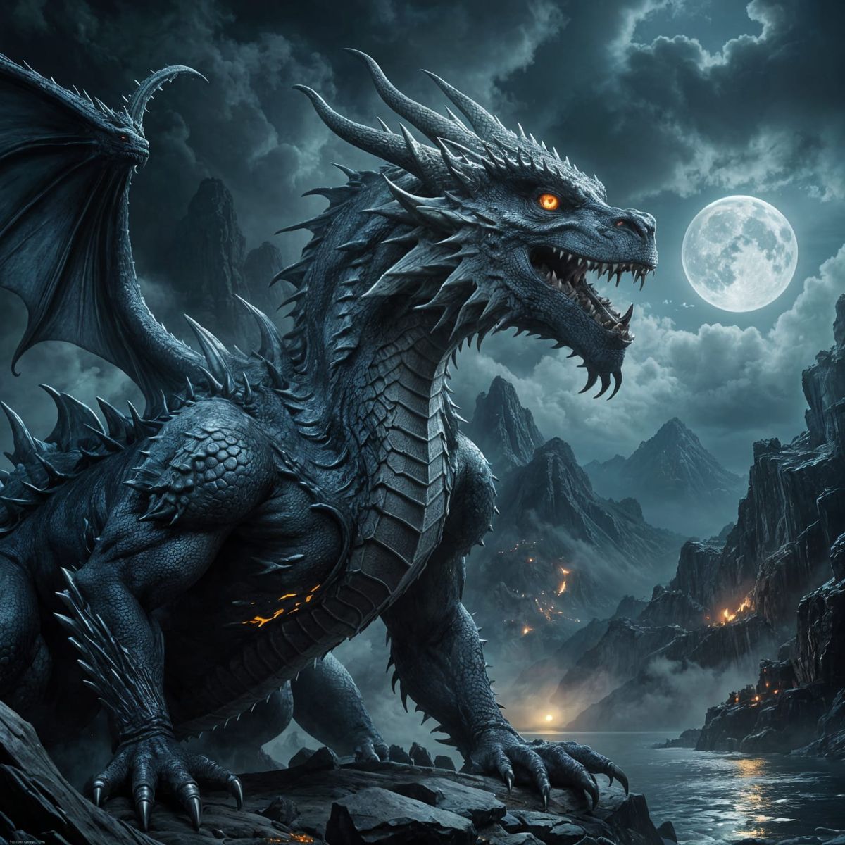 This image shows a colossal, dark-scaled dragon partially concealed by mist. Its eyes gleam with mischief, and smoke drifts from its nostrils under the moonlight.