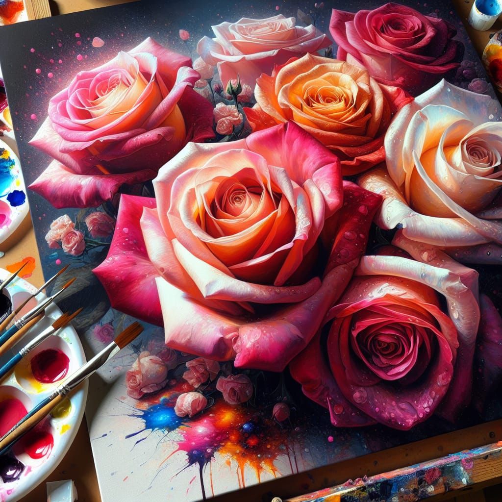 A hyperrealistic acrylic painting of roses with intricate details and rich color depth. The dramatic lighting and a splash art background enhance the tension and depth of this stunning image.