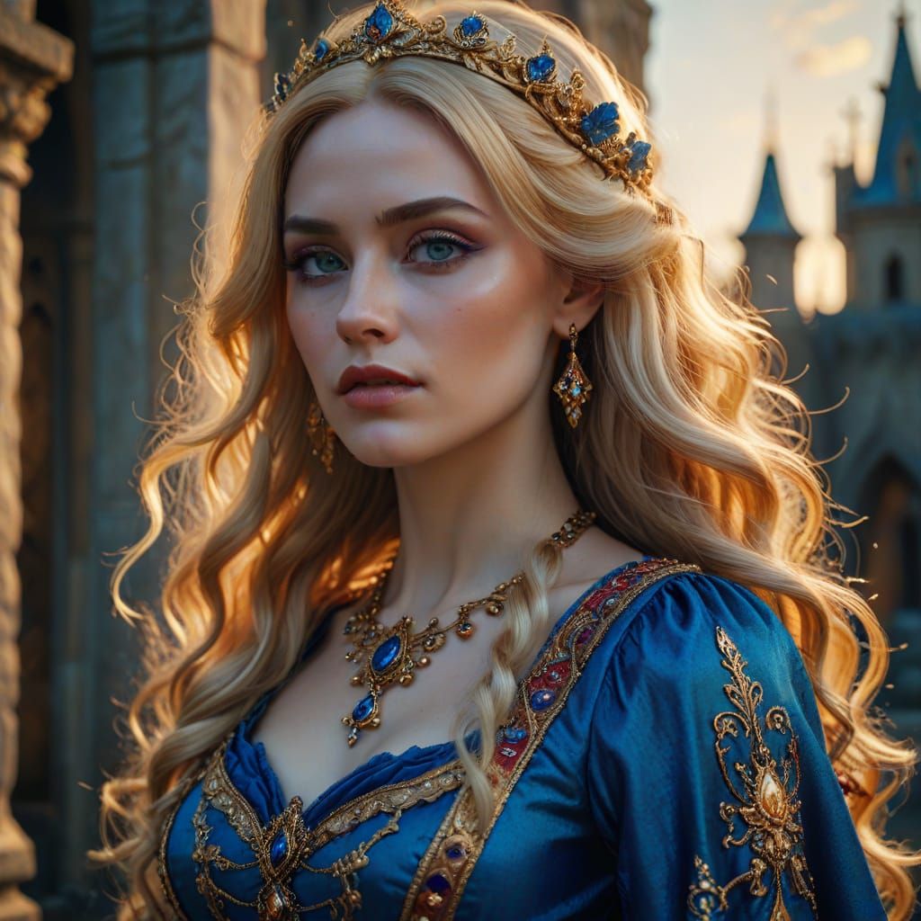 This image showcases a stunning close-up of a woman in a breathtaking blue dress, surrounded by the opulence of fantasy fashion, with vivid colors and ornate details, reminiscent of a cinematic film still from a Netflix animation.