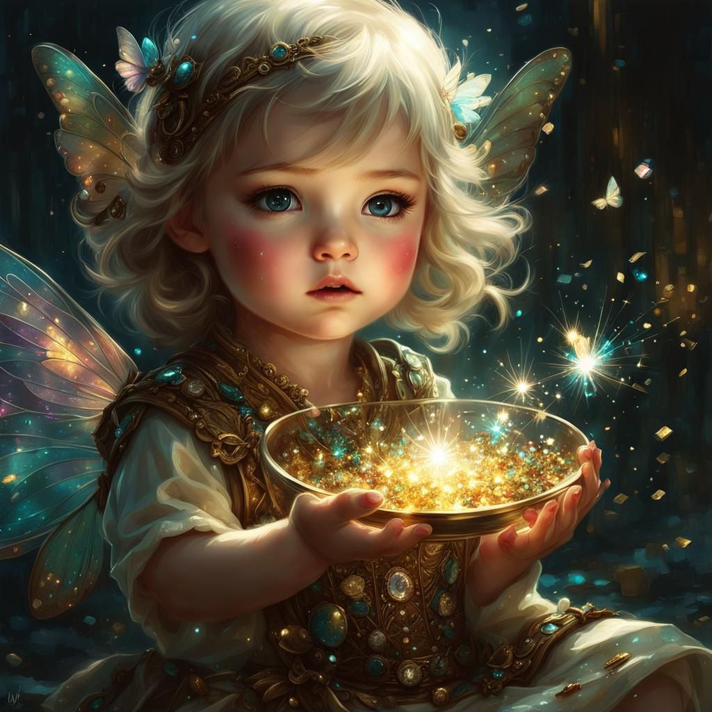 A delicate, intricately detailed fairy is shown throwing glitters from a pouch, surrounded by bright dramatic lighting and deep depth of field, showcasing her stunning, elaborate costume and gorgeous eyes.