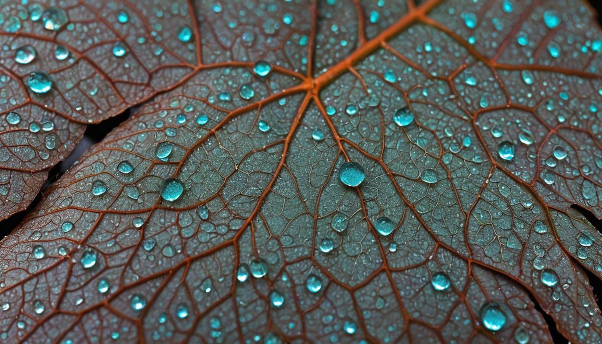 This image showcases a macro photograph of an unusual turquoise leaf, possibly of alien origin. The close-up shot highlights the intricate leaf veins, glistening dewdrops, and soft morning light.