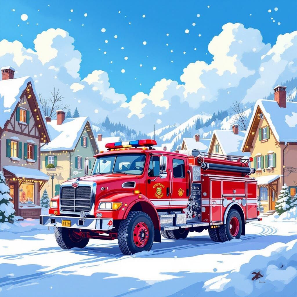 A vibrant watercolor painting of a large red firetruck parked in a snow-covered village square. The scene features houses decorated with fairy lights under a bright blue sky, rendered with bold brushstrokes.