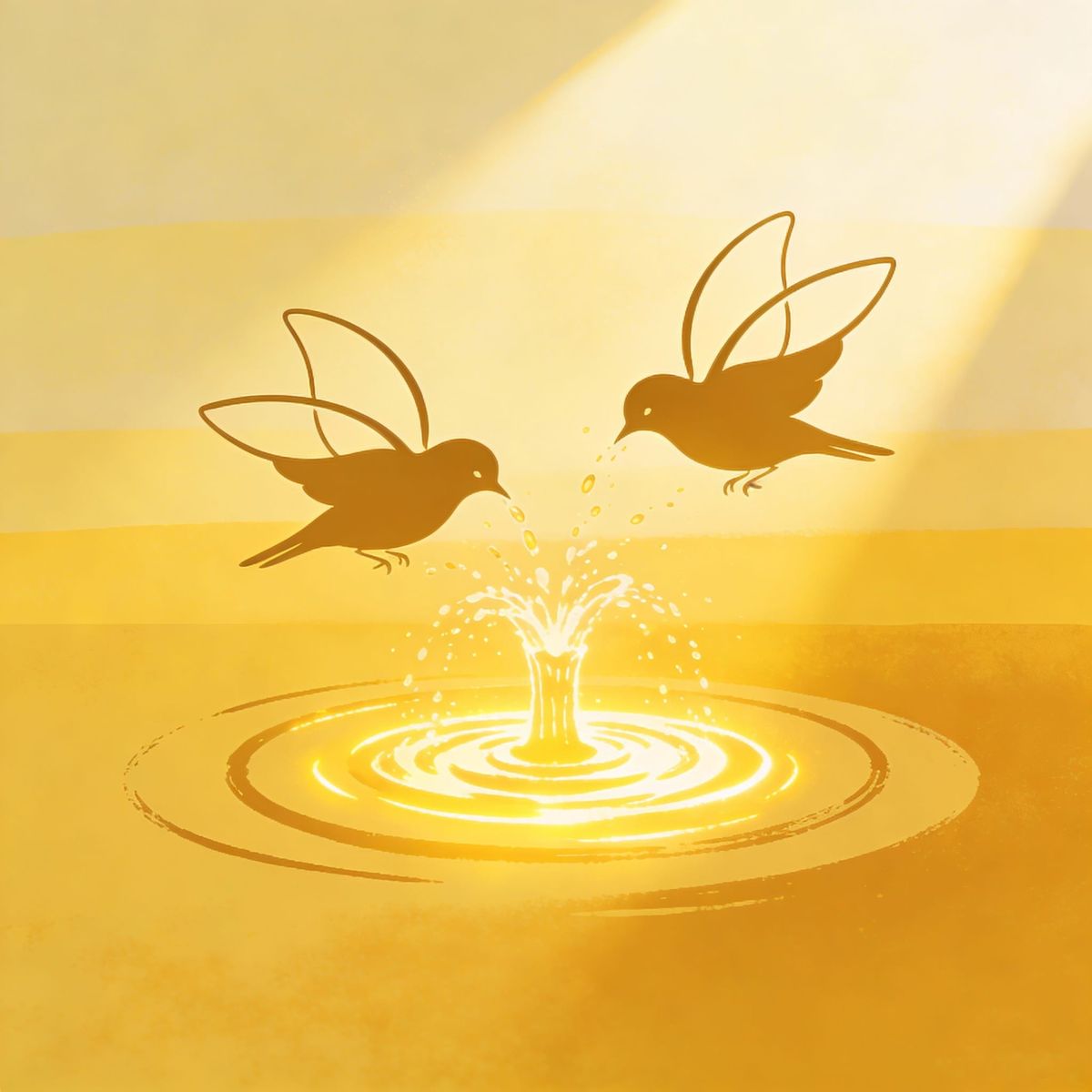 This image showcases a minimalist scene of two birds bathing in a fountain, depicted in various shades of yellow. The art style emphasizes clean lines, geometric shapes, and a warm, monochrome palette to evoke joy and serenity.