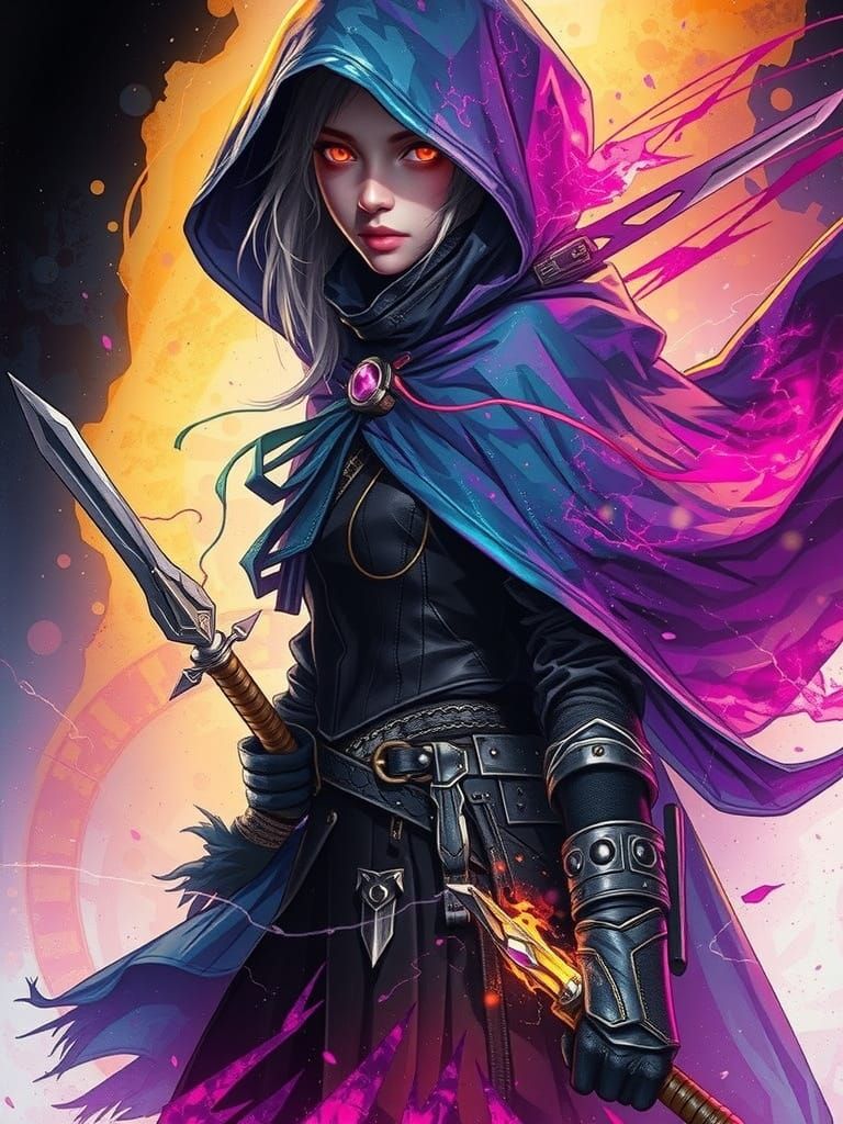 A hyperdetailed digital image of a hooded rogue assassin. She holds flaming daggers and radiates electrical energy, with vibrant glowing colors in a gritty, realistic anime style.