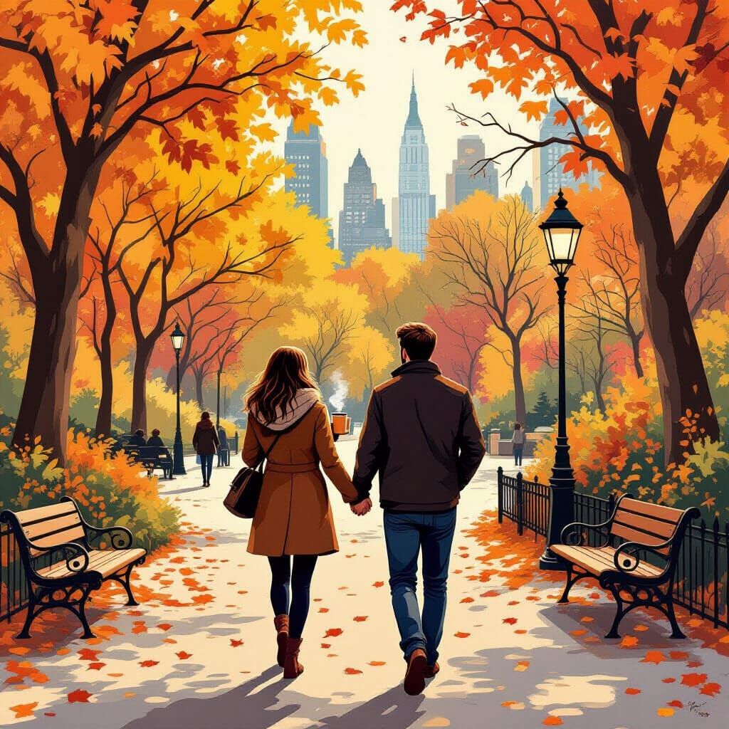 A vibrant image of a couple walking hand in hand through Central Park in autumn. Golden leaves and rustic tones create a whimsical scene, with a painterly aesthetic.