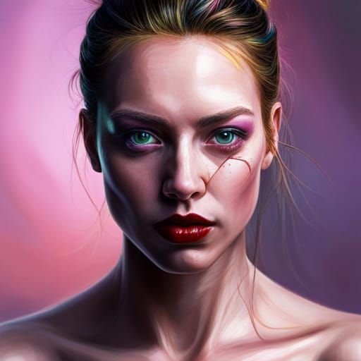 This image shows a hyperrealistic portrait of a girl in a colorful world. The mid-shot image is intricately detailed with a dramatic side light and a vibrant splash art aesthetic.