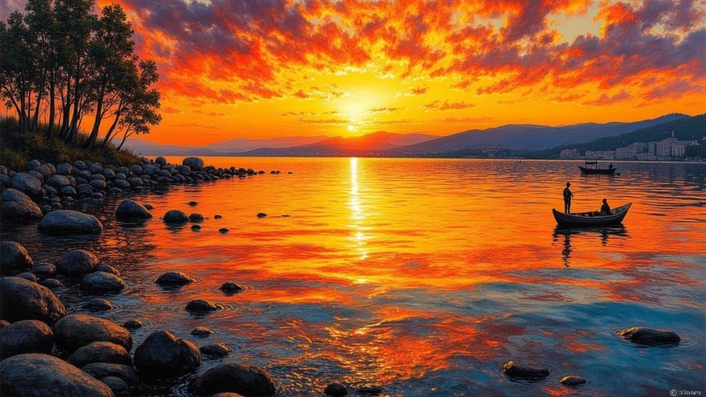 A surreal, cubist sunset reflecting on Lake Varese. The vibrant artwork evokes a sense of warmth and light, reminiscent of mid-century surrealist and cubist painters.