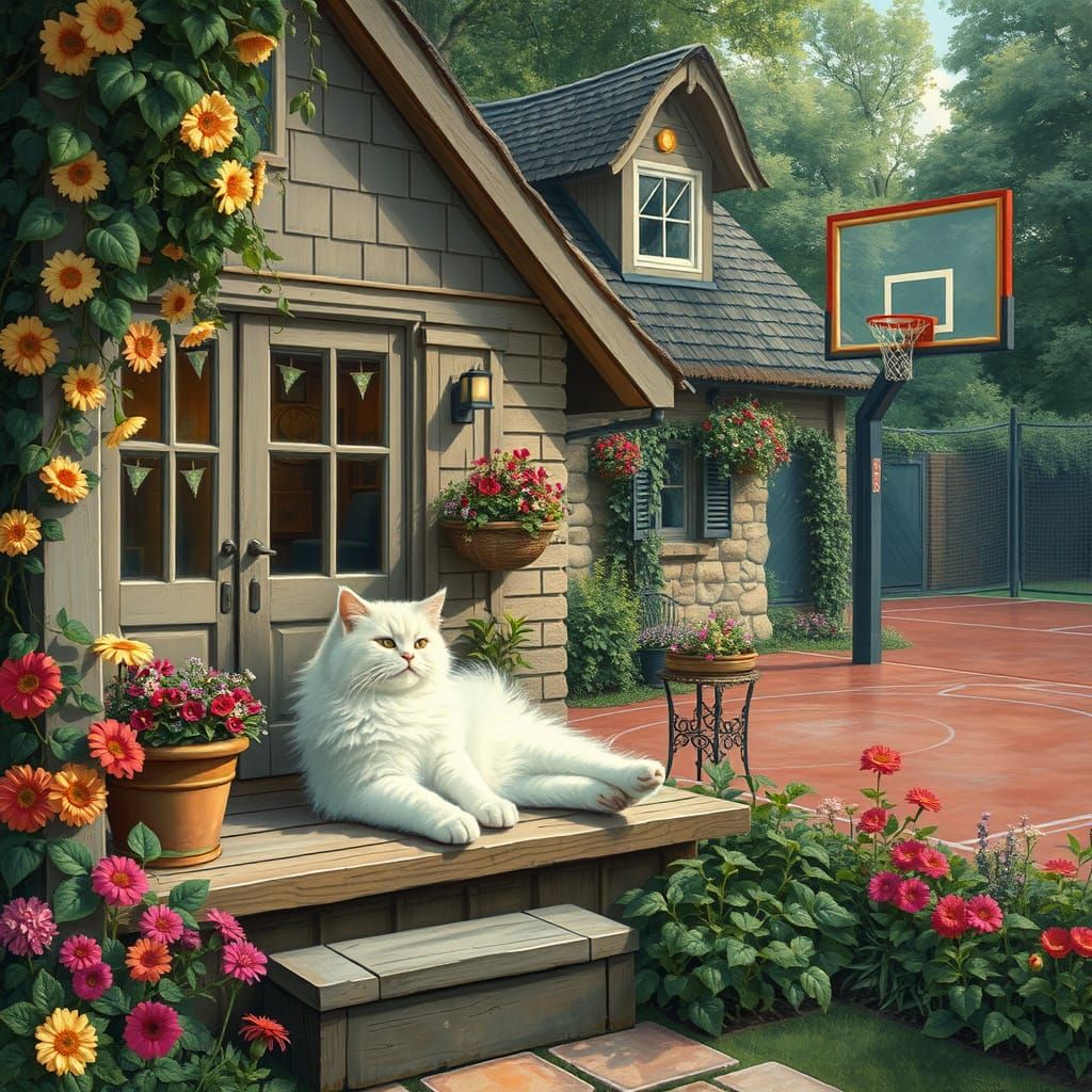 A serene image of a white cat resting on a cottage porch next to a basketball court. The scene is rich with vibrant plants, players relaxing, and Pre-Raphaelite artistic style.