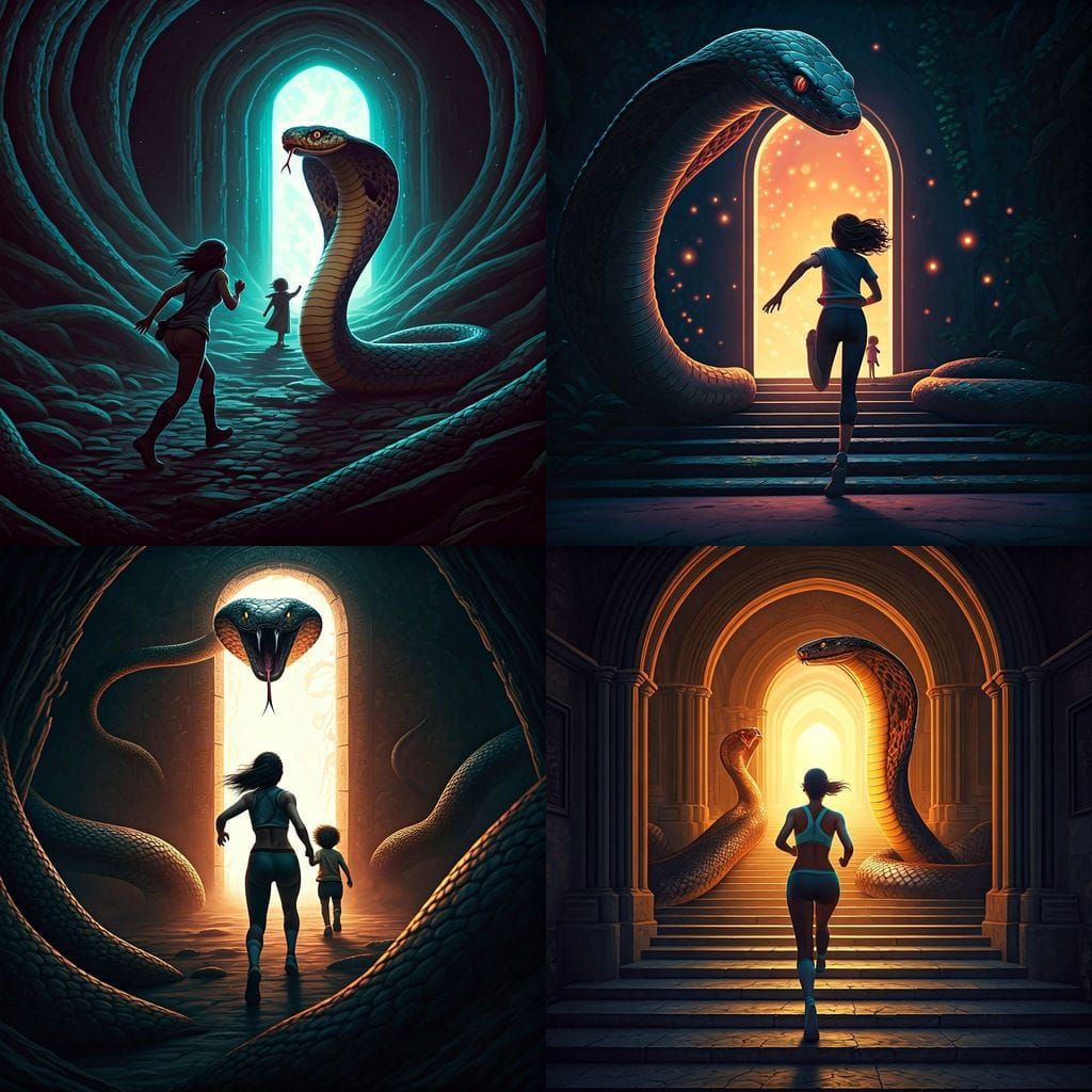 This image shows a woman fleeing a massive snake and encountering a child beckoning her toward a concealed portal. The scene blends danger with the promise of escape.