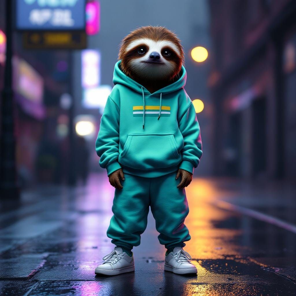 This image shows an anthropomorphic sloth confidently posing on wet pavement. The sloth is wearing pastel streetwear, including a cyan hoodie and green-striped sweatshirt, in a photorealistic style.
