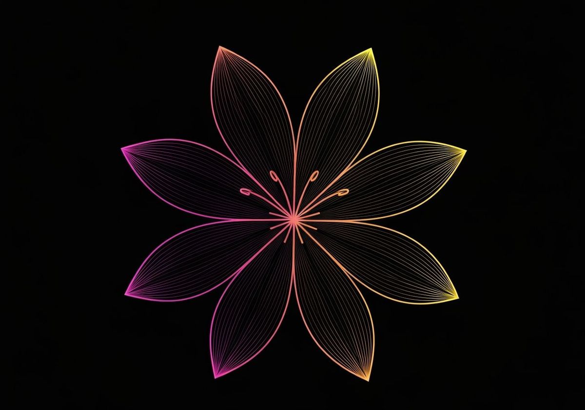 This image shows a minimalist neon line art illustration of a six-petal flower. The flower is outlined in a pink, orange, and yellow gradient on a solid black background.