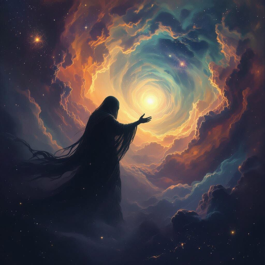 This image features a solitary figure reaching for a star within a swirling, vibrant cosmic dust cloud. It evokes infinite wonder and profound isolation, inspired by cosmic surrealism and nebulae art.