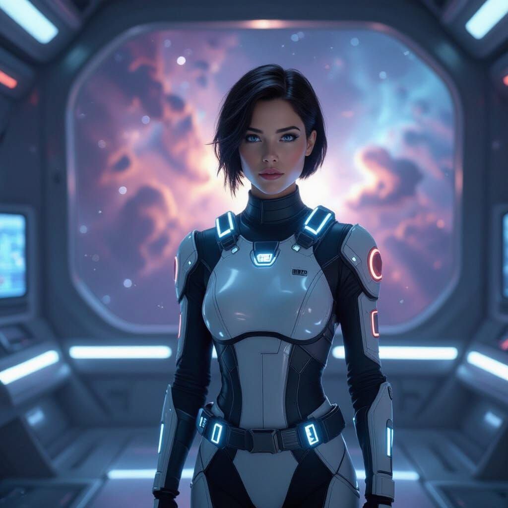 This image shows Loxy Isadora Bliss, a space explorer with short dark hair and piercing blue eyes, on a starship bridge. The scene, with a swirling nebula backdrop, is rendered in atmospheric realism.