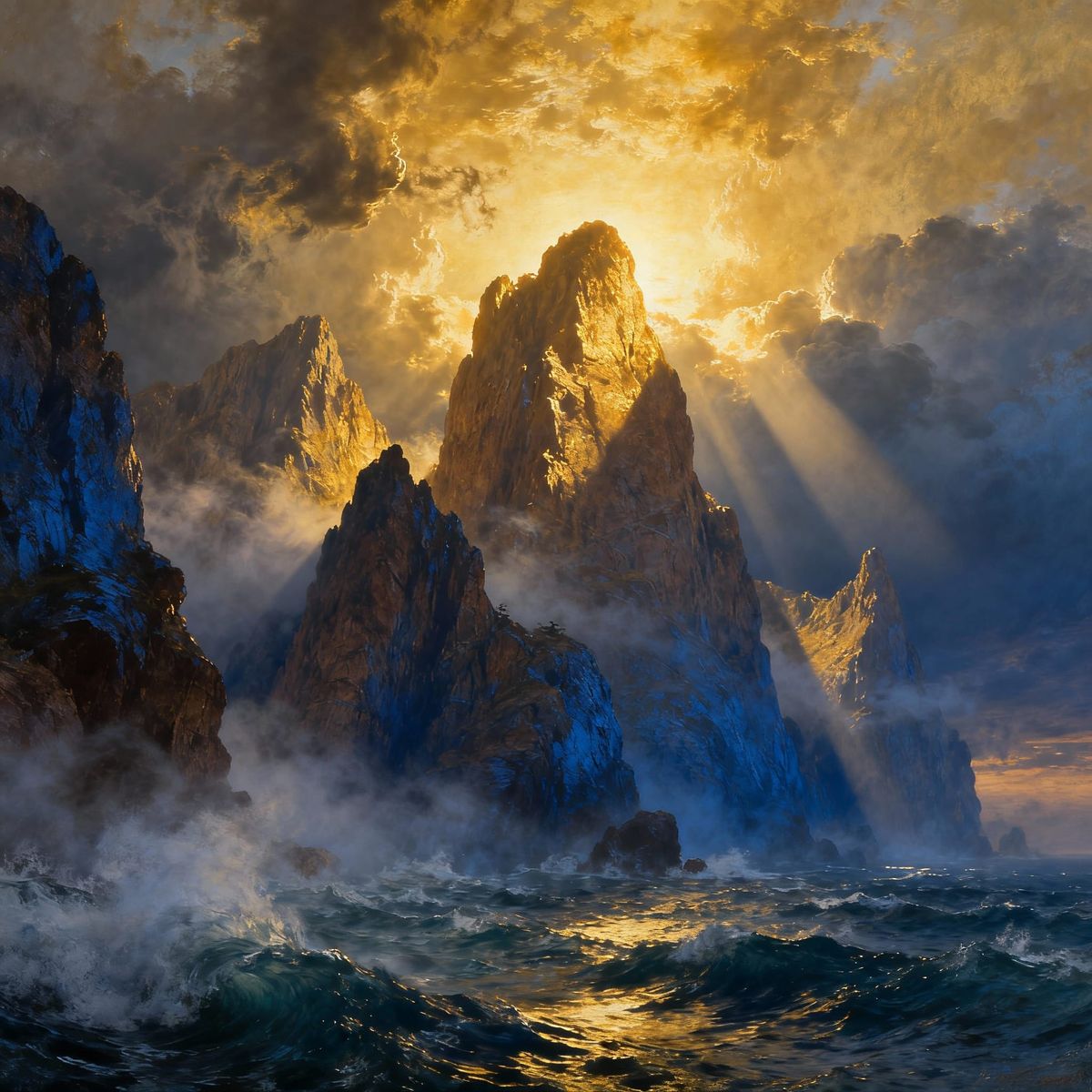 This image shows the dramatic, imposing Pillars of Hercules at dawn, rising from a turbulent sea shrouded in mist. Golden sunlight creates an ethereal glow on the peaks, evoking awe and mystery.