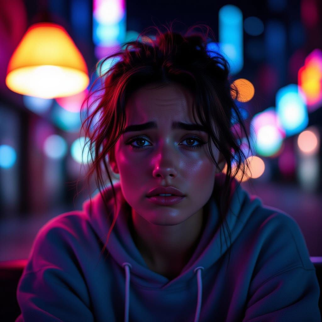 A photorealistic image of a tired individual in messy hair and rumpled clothes, illuminated by a single lamp against vibrant neon city lights at night. Shot with cinematic lighting for a mood of weary solitude.