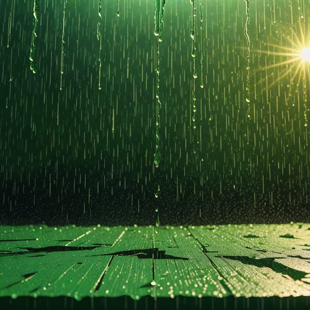 This image shows a close-up of chewed, burst green cardboard against a rainy backdrop. The artwork features vibrant triadic colors and golden light, rendered in a geometric Bauhaus style.