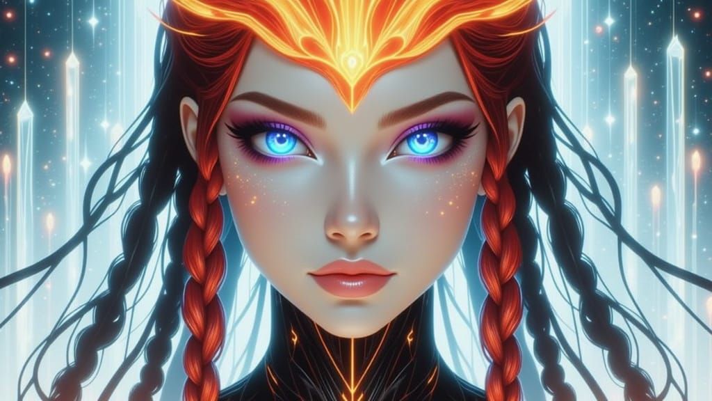 Woman with pale skin with light purple and red sheen, silver eyes. DSLR clarity A long range portrait of an ethereal ice entity with long red, and orange hair, interwoven with thin black braids. They are wearing a flaming crown of black ice that is burning into a blue flame. Gothic background <lora:Gridrunners ...