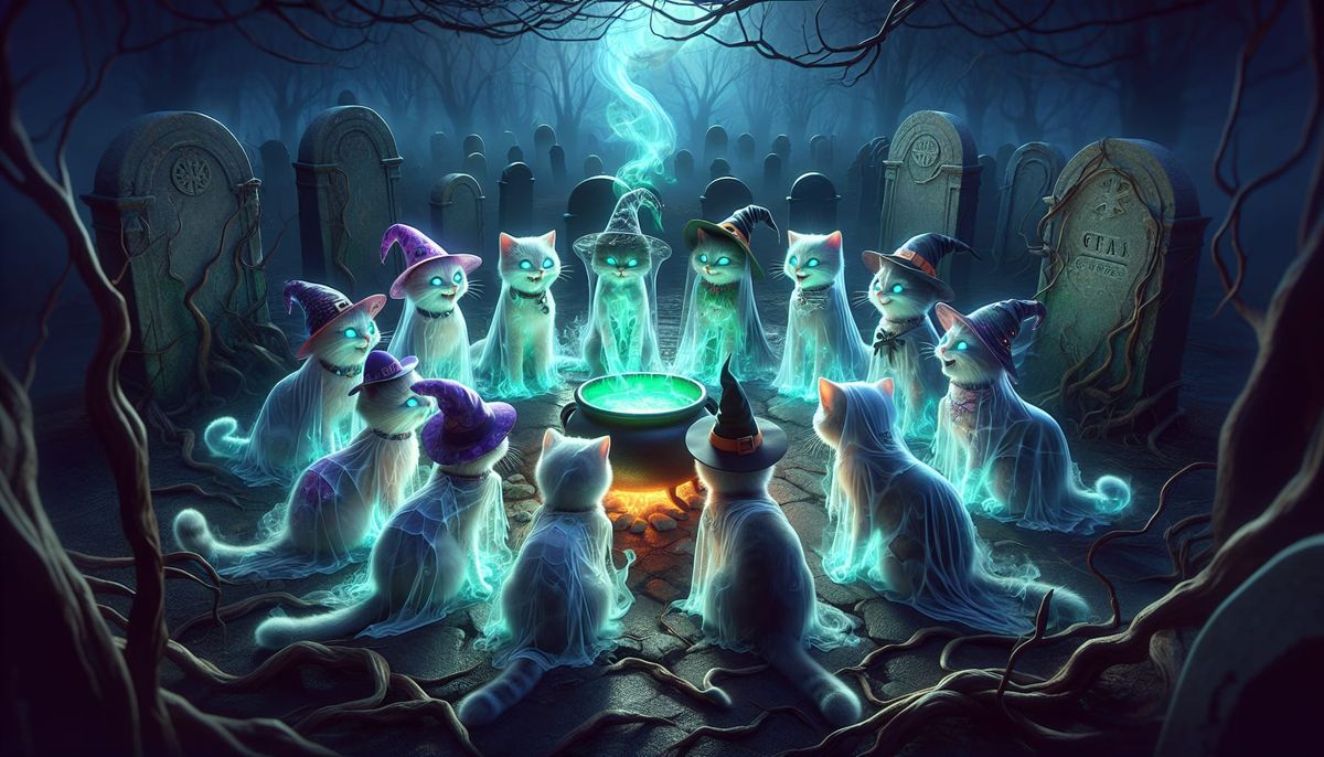 This image shows spectral cats in Halloween costumes gathered in a haunted graveyard around a glowing cauldron. The concept art uses theatrical lighting and rich contrast for a dark fantasy Halloween horror scene.