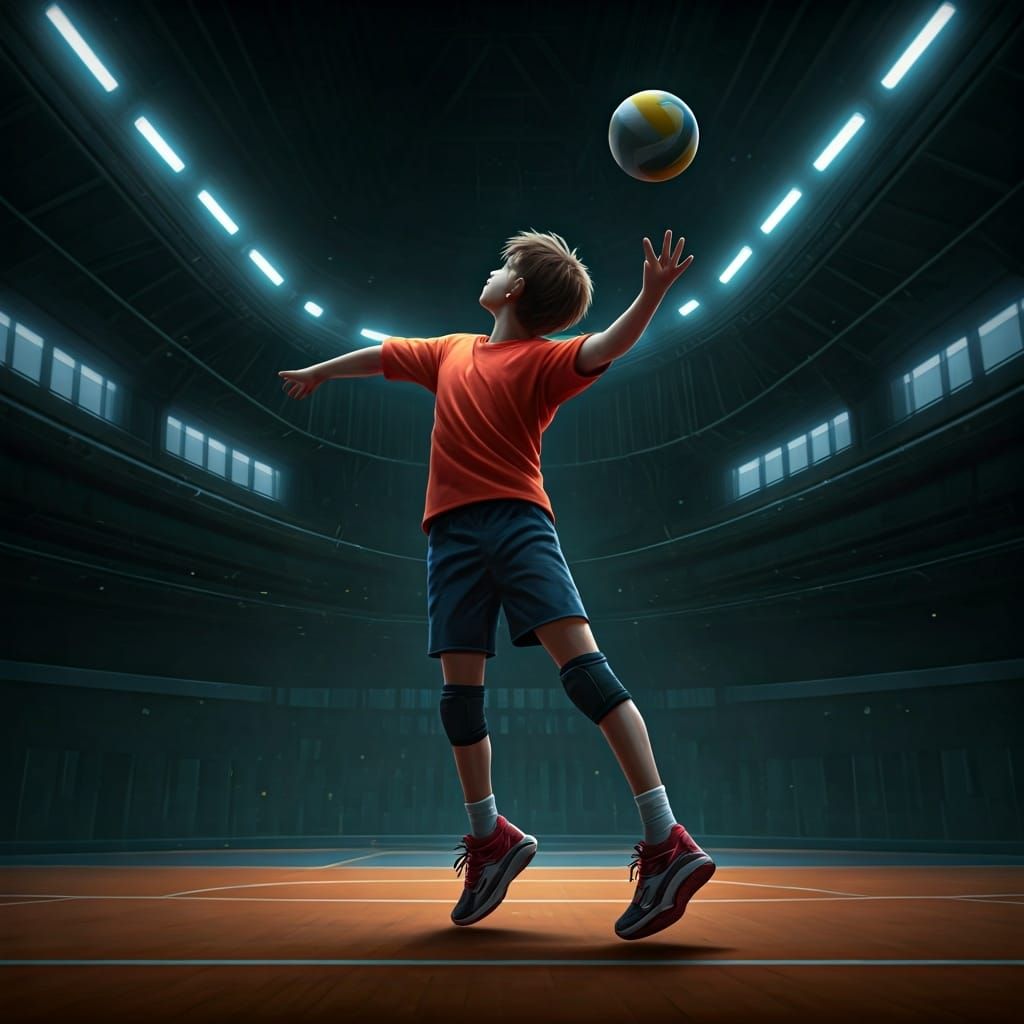 A dynamic image of a boy spiking a volleyball on an indoor court. The scene features dramatic lighting and vibrant colors in a digital art style.