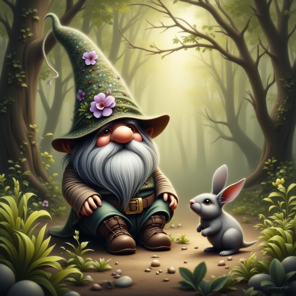 This image showcases a charming male gnome accompanied by a small rabbit within a detailed woodland setting. The scene evokes a sense of fantasy and nature.