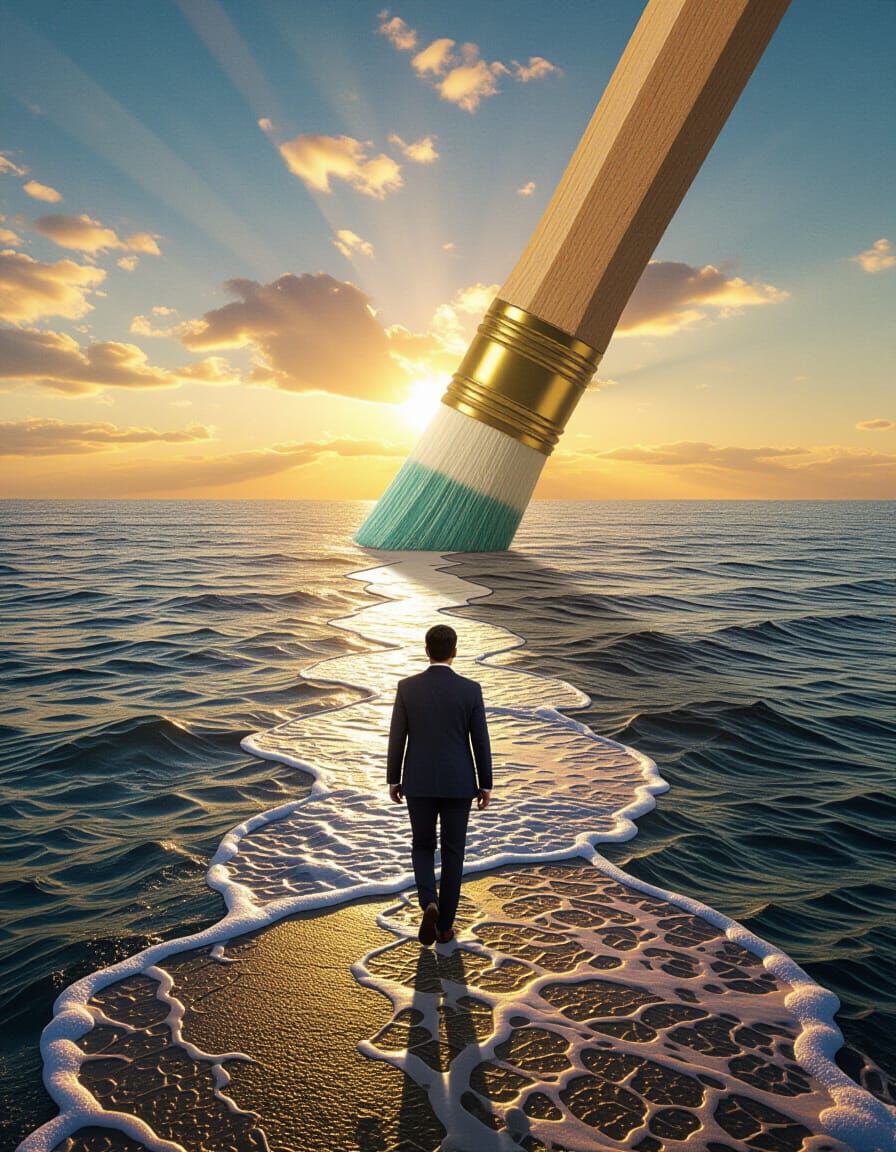 This image shows a businessman confidently walking across a narrow strip of land, created by a giant eraser, cutting through the ocean. The artwork features vivid colors and dramatic lighting in a splash art style.