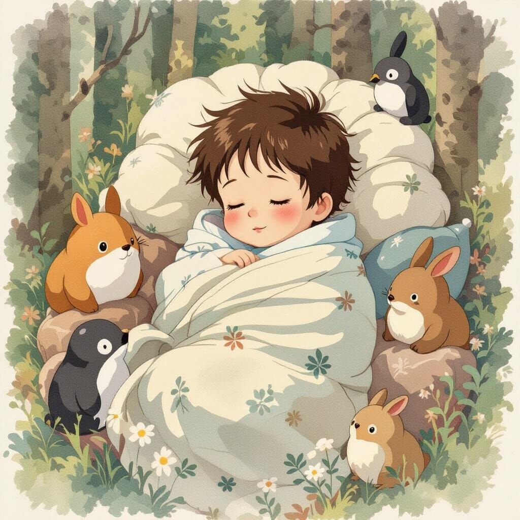A heartwarming image of a peacefully sleeping newborn baby nestled among woodland creatures. The scene evokes a whimsical Studio Ghibli aesthetic with warm colors and intricate details.