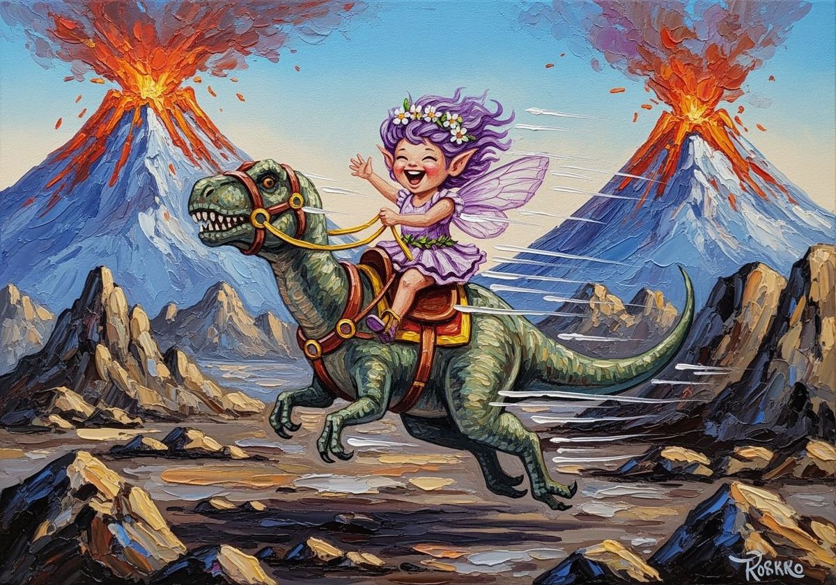 This image shows a purple fairy riding a dinosaur through a rugged Jurassic landscape with volcanoes. The whimsical painting uses bold brush strokes and thick impasto techniques in a post-impressionist style to depict the scene.