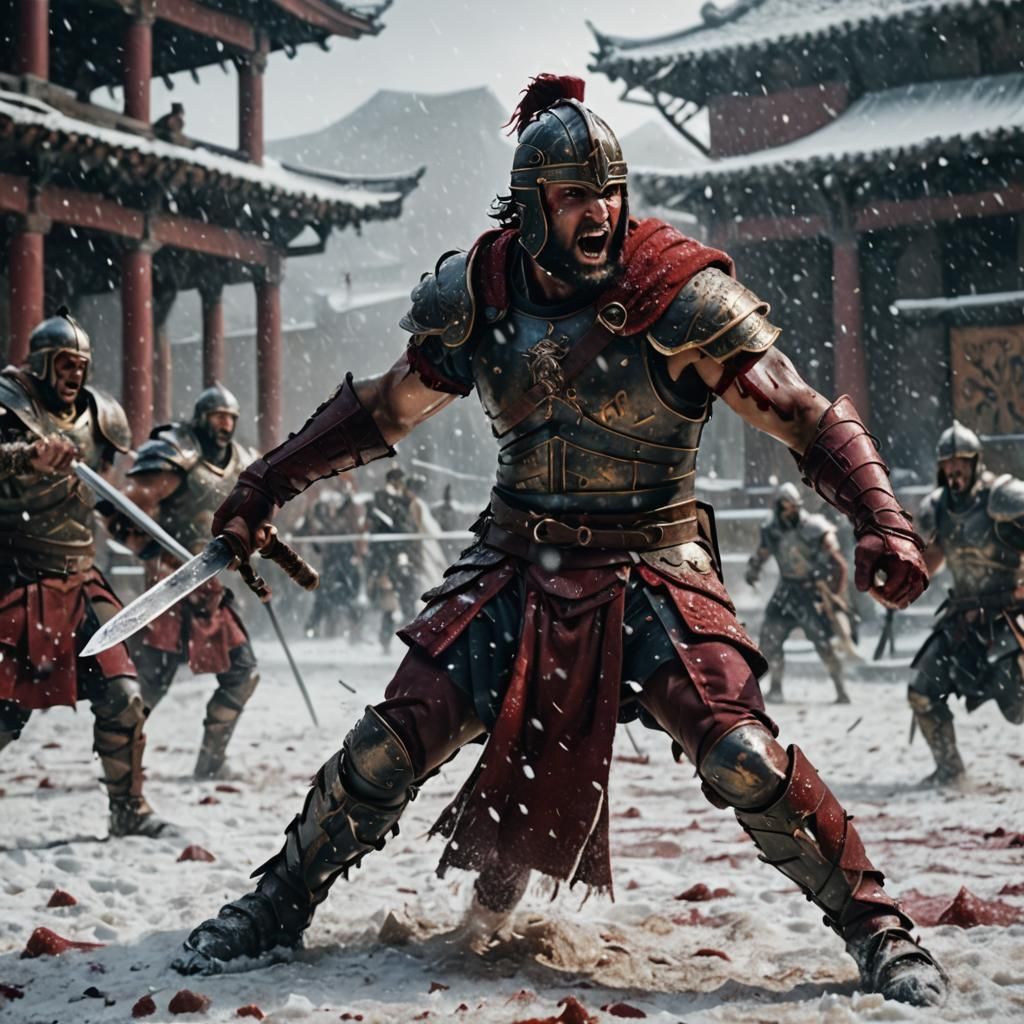 A striking picture of a muscular gladiator in red armor battling in a snowy arena. The image features a gritty, high-contrast film style, with cinematic lighting and a warm golden hour glow.