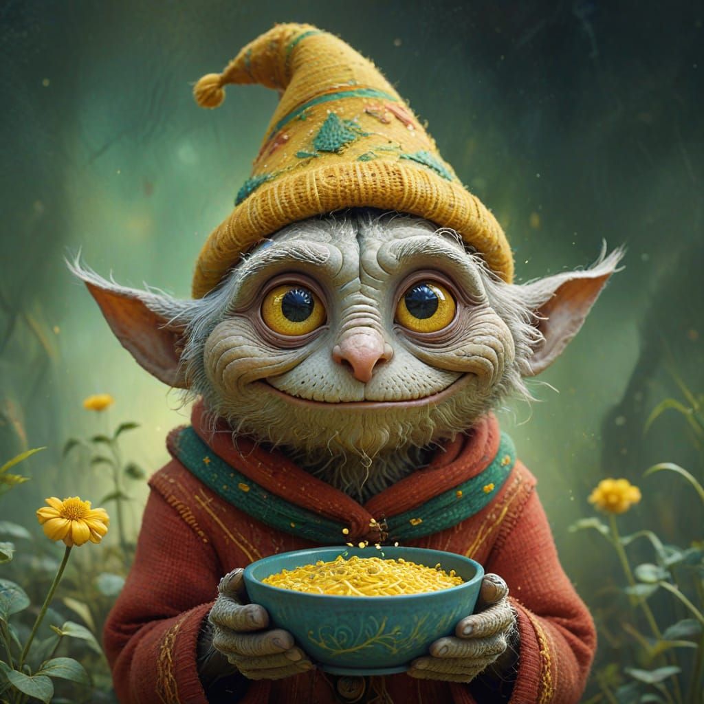 This watercolor illustration features a charming, anthropomorphic creature with a sweet smile and intricate details, set against a soft focus background with bold, textured brushstrokes and a warm, golden lighting effect.