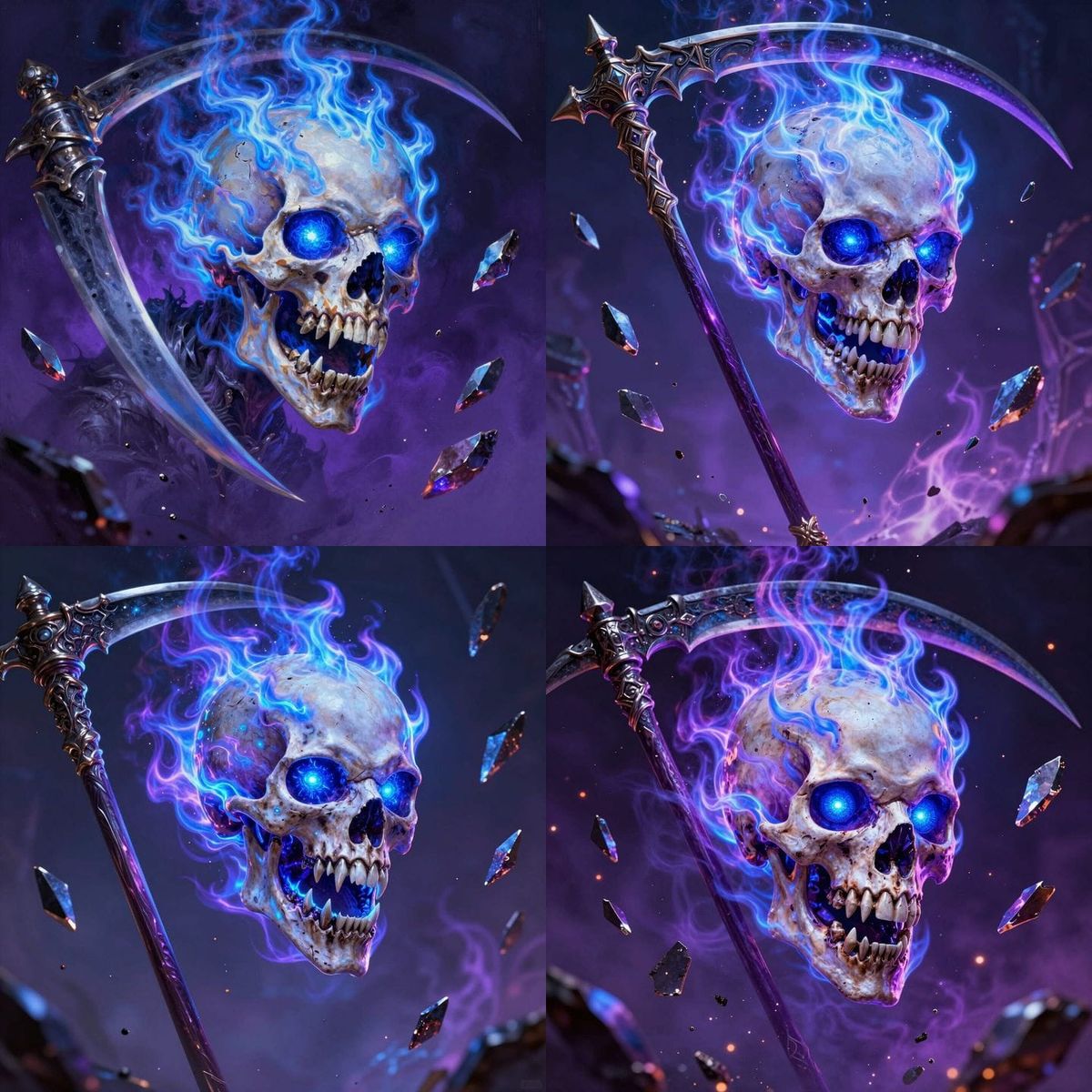 This image features an intensely detailed flaming skull with glowing blue eyes and sharp teeth, surrounded by aggressive blue and purple flames. A scythe and metallic shards add to the surreal, abstract fantasy wallpaper.