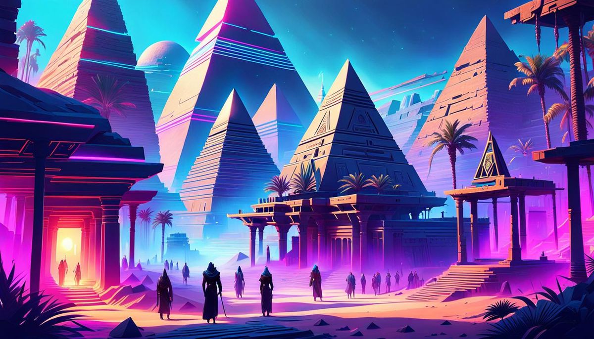A vibrant cyberpunk cityscape blends ancient Egyptian architecture and pyramids. This digital artwork features a surreal synthwave aesthetic with expansive depth of field, reminiscent of trending ArtStation styles.