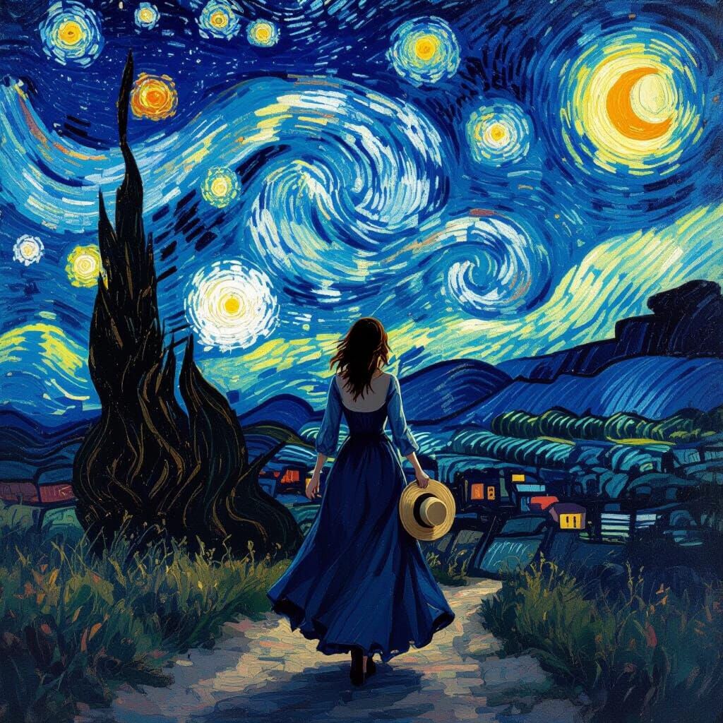 This image shows a woman in a village beneath a swirling, star-filled sky. The artwork evokes the style of Van Gogh, using thick brushstrokes and vibrant colors to capture a dreamy, mystical atmosphere.