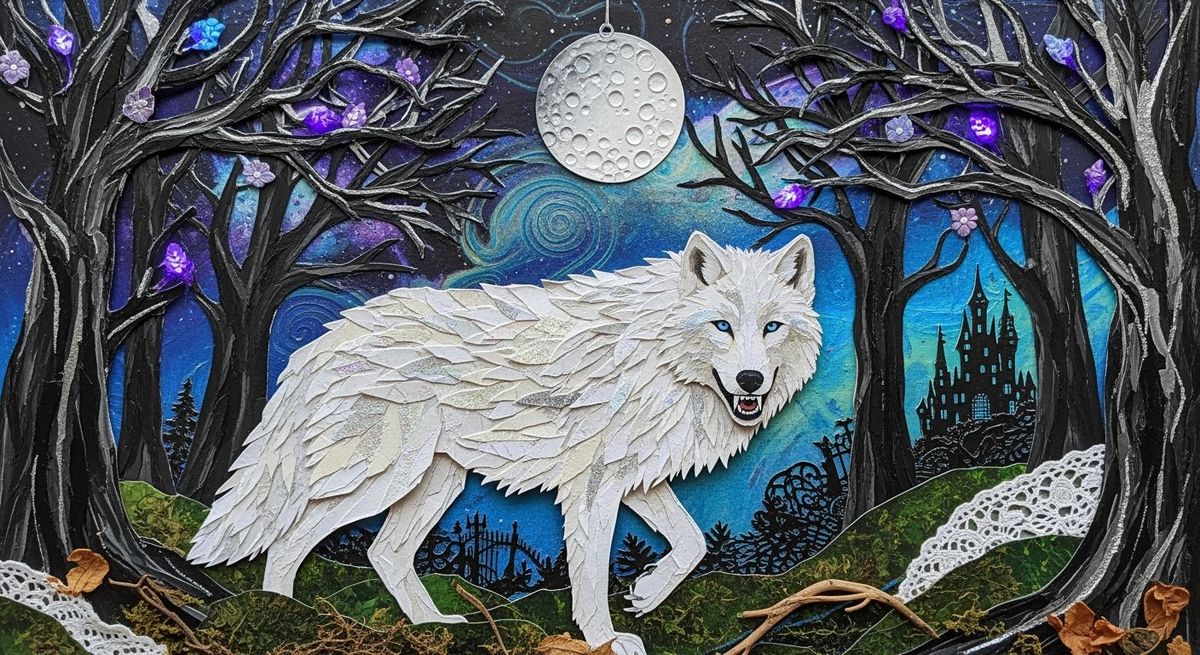 This mixed media collage features a white wolf with luminous fur and piercing blue eyes in a fantasy forest. Gothic elements and a full moon add a mystical, ethereal glow.