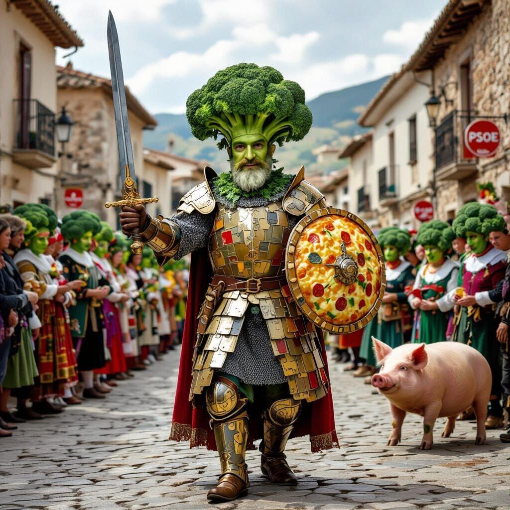 This image depicts a surreal Spanish village festival. A central figure, a knight crafted from tapas plates with broccoli hair, wields a tortilla sword and patatas bravas shield amidst villagers and a golden pig.